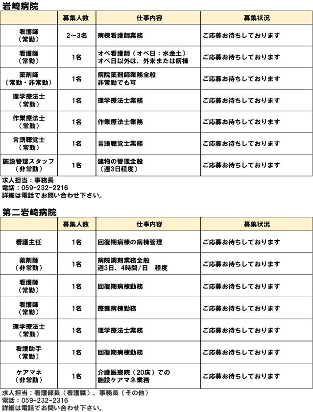 電話でのご予約・お問い合わせは 第二岩崎病院 TEL.059−232−2316 通所リハビリテーション TEL.059−236−5277